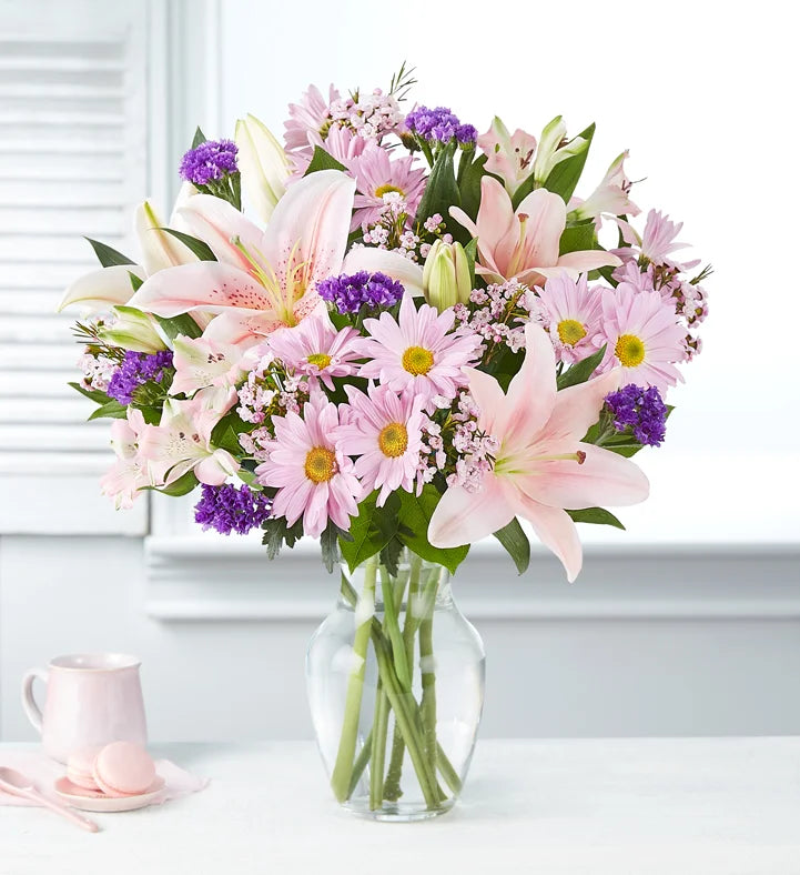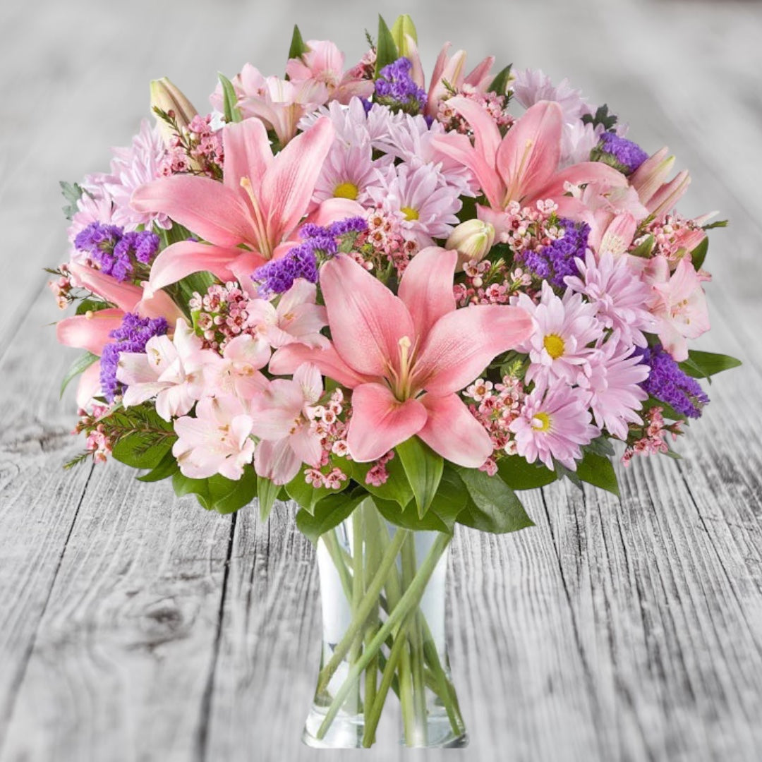 Celebrate the people and moments you treasure most with our exclusive Floral Treasures bouquet. A stunning bouquet that brings together an abundance of blooms in shades of lavender and pink, creating a striking blend of color.